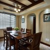 本套餐厅装饰比较简洁,石膏板吊顶上添加了装饰木方做装饰,可以将中间的吊灯衬托的十分别致,下方的实木餐桌并没有过多的造型设计,但这种大气之势也正是因此而彰显出来的。