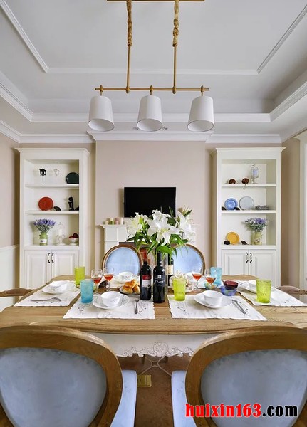 本套餐厅装饰中空间内的色彩比较淡雅,但整体的装饰中却展现出了不俗的设计感,虽然没有欧式风格的华美与惊艳,但这种装饰所带给我们的亲切感,也是其它装饰中所没有的。