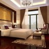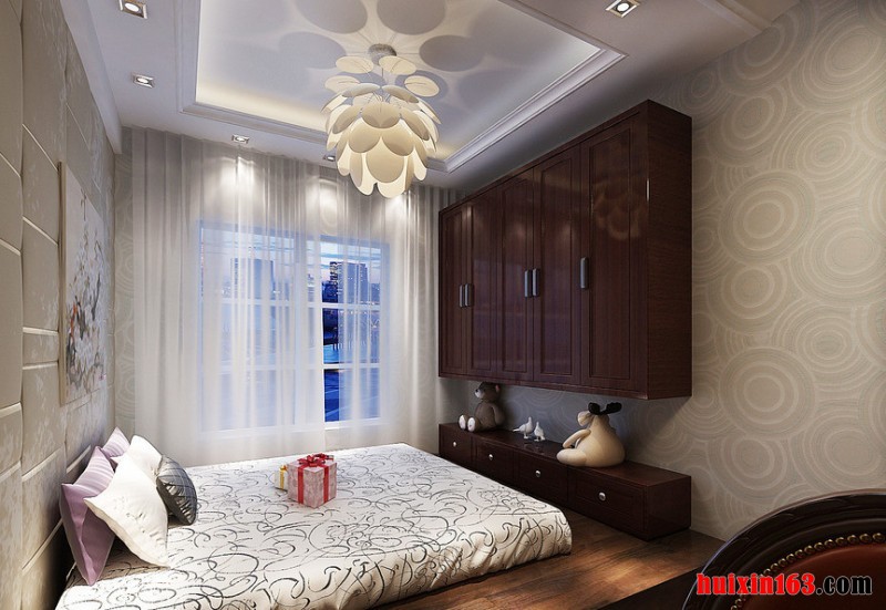 卧室吊顶使用的装修材料是石膏板,白色的石膏板增加了房间内的纯朴感觉,石膏板吊顶中间安装了一盏吸顶式的水晶灯饰,在灯光的照射下显得更加晶莹剔透,将整间卧室都映衬的非常华美,室内采用胡桃木雕花家具设计,雕花精美,做工精细,制作工艺精湛,胡桃木家具与罗汉床搭配的相得益彰,古色古香,与地砖成一个上下相互呼应之势看上去具有较好的观赏性和实用性。卧室中的装饰比较素雅,但非常的舒适,可以让人们感到放松。