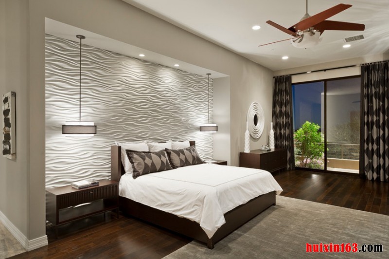 卧室不仅使人视线得到扩展,放松,更与深色的地板形成对比,相得益彰。为卧室“穿”上了一层朦胧,耐人寻味。家居饰品方面大量采用古典木质结构。地面处理采用仿木实木铺设而成,墙面采用漆面涂刷和木框镶拼制作而成,顶棚平滑亮泽,整体协调统一,古朴典雅。
