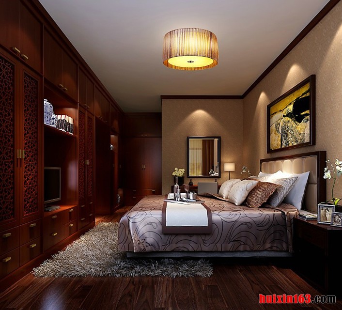 本套装修为古典型装修,卧室地面采用地板装修,吊顶采用石膏板进行平顶吊顶,加以火红吊灯做装饰,柔软的床,坐上去软绵绵的,好舒服,带来文化性和独特魅力,营造了一个静谧的独立的空间。