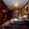 卧室不仅使人视线得到扩展,放松,更与深色的地板形成对比,相得益彰。为卧室“穿”上了一层朦胧,耐人寻味。家居饰品方面大量采用古典木质结构。地面处理采用仿木实木铺设而成,墙面采用漆面涂刷和木框镶拼制作而成,顶棚平滑亮泽,整体协调统一,古朴典雅。
