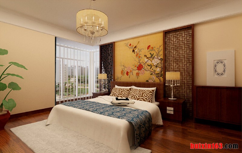 本套装修为古典型装修,卧室地面采用地板装修,吊顶采用石膏板进行平顶吊顶,加以火红吊灯做装饰,柔软的床,坐上去软绵绵的,好舒服,带来文化性和独特魅力,营造了一个静谧的独立的空间。