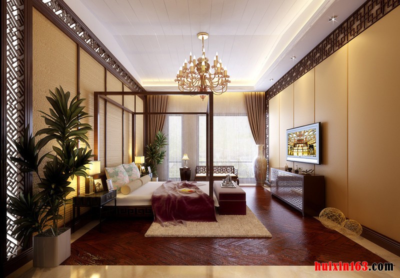 本套装修为古典型装修,卧室地面采用地板装修,吊顶采用石膏板进行平顶吊顶,加以火红吊灯做装饰,柔软的床,坐上去软绵绵的,好舒服,带来文化性和独特魅力,营造了一个静谧的独立的空间。