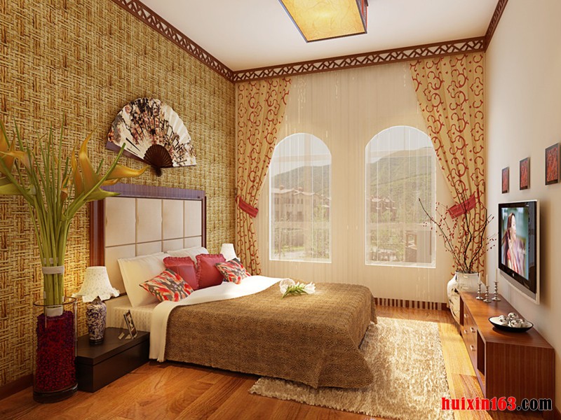 本套装修为古典型装修,卧室地面采用地板装修,吊顶采用石膏板进行平顶吊顶,加以火红吊灯做装饰,柔软的床,坐上去软绵绵的,好舒服,带来文化性和独特魅力,营造了一个静谧的独立的空间。