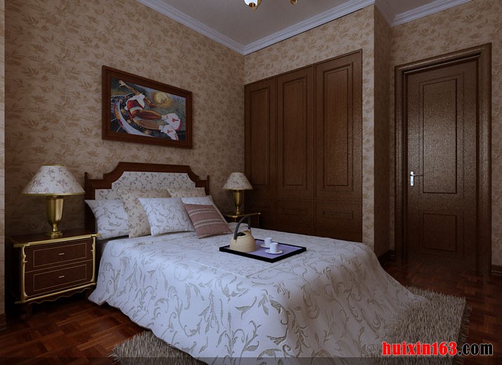 卧室采用平直流畅的几何线条吊顶造型,简明利落,卧室吊顶并未设置主灯,白天,窗外射入的光线足够照亮家居,夜晚吊顶四周的射灯搭配台灯便可点亮家居,还能营造出温馨祥和的气氛,十分舒适惬意。而实木添置的家具以及个性的雕花处理,也将空间装饰得惟妙惟肖。端庄,沉稳的电视背景完美的展现了古典的生活理念。整个空间带着东方韵味走进了现代的生活。