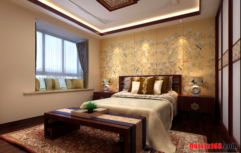 卧室端庄大气尽显其能、婉约般透露出雄厚的底气。整个空间提取了传统古典家居韵味,又融入了现代生活符号,充满中国韵味的剪纸使风格的体现的淋淋尽致。
