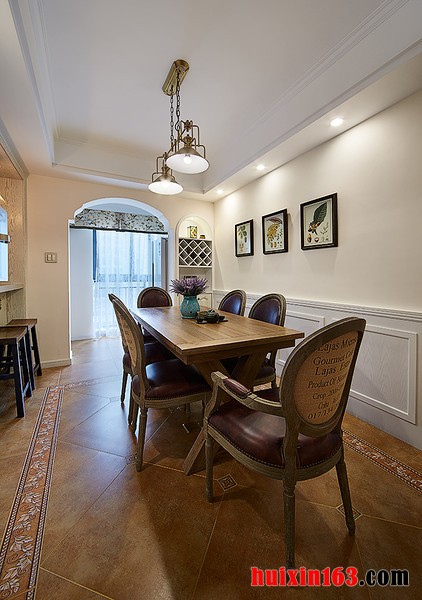 美式风格的居室装修比较注重细节处理,空间内的色彩搭配比较淡雅,偶尔的彩色饰品可以在整个空间起到点缀的作用,可以使空间的装饰气氛活跃起来,带给人们一丝新鲜感,也凸显出美式风格的装饰特点。 本套餐厅装饰中空间内的色彩搭配比较素雅,唯一可以起到点缀效果的便是餐桌上的两盆新鲜绿植,在素雅的空间内绿色会显得格外鲜艳,可以使整个空间都充满生机,也将装饰显得更加富有现代气息。 更多»推荐家装效果图