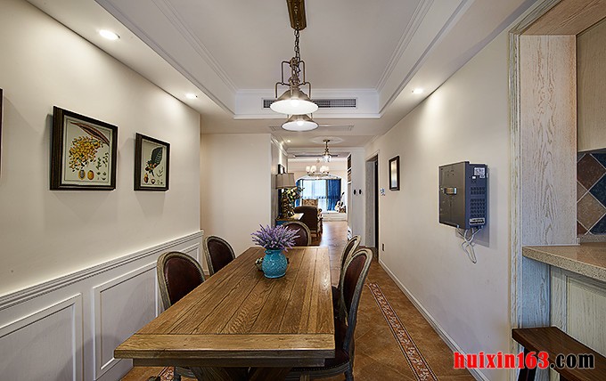 美式风格的居室装修比较注重细节处理,空间内的色彩搭配比较淡雅,偶尔的彩色饰品可以在整个空间起到点缀的作用,可以使空间的装饰气氛活跃起来,带给人们一丝新鲜感,也凸显出美式风格的装饰特点。