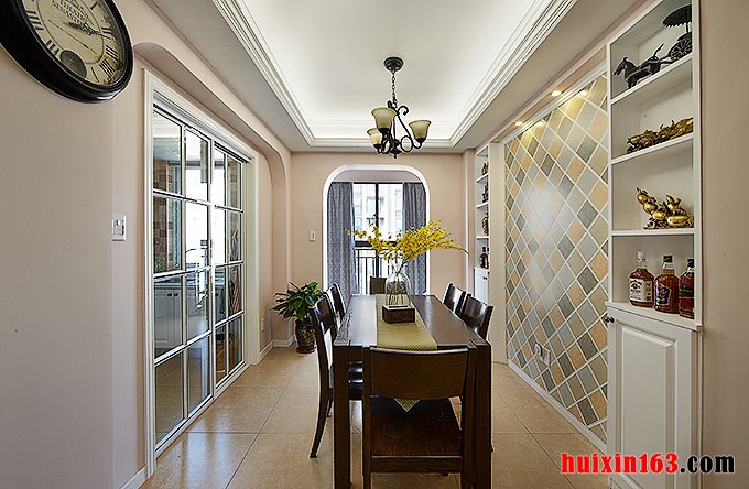美式风格的居室装修比较注重细节处理,空间内的色彩搭配比较淡雅,偶尔的彩色饰品可以在整个空间起到点缀的作用,可以使空间的装饰气氛活跃起来,带给人们一丝新鲜感,也凸显出美式风格的装饰特点。