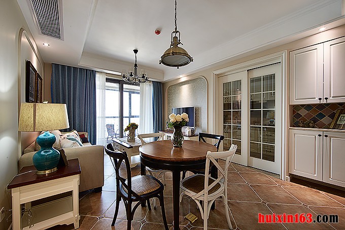 美式风格的居室装修比较注重细节处理,空间内的色彩搭配比较淡雅,偶尔的彩色饰品可以在整个空间起到点缀的作用,可以使空间的装饰气氛活跃起来,带给人们一丝新鲜感,也凸显出美式风格的装饰特点。