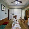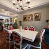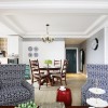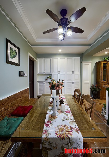 强烈的色彩对比可以在视觉上带给人们一种冲击感,在美式风格的装饰中我们很经常就会感受到这种设计方式,难以驾驭的色彩只要懂得搭配,也会带给人们意想不到的惊喜,将这种设计应用在装饰居室中,自然会带给人们一种时尚感。 本套餐厅装饰中,空间内的石膏板吊顶设计比较简洁,四周使用了简单的线条设计勾勒出了平淡的造型,却使整个空间都显得十分大气,中间的吊灯也在石膏板的衬托下显得更加富有个性,同时也将美式风格的特点彰显了出来。 更多»推荐家装效果图