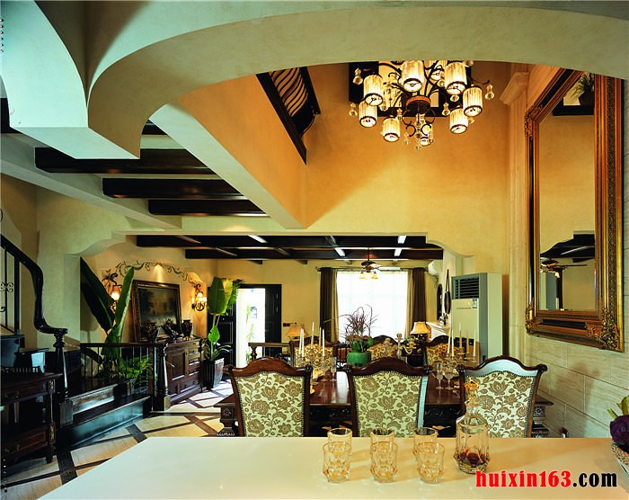 本套餐厅装饰中,空间内的石膏板吊顶设计比较简洁,四周使用了简单的线条设计勾勒出了平淡的造型,却使整个空间都显得十分大气,中间的吊灯也在石膏板的衬托下显得更加富有个性,同时也将美式风格的特点彰显了出来。