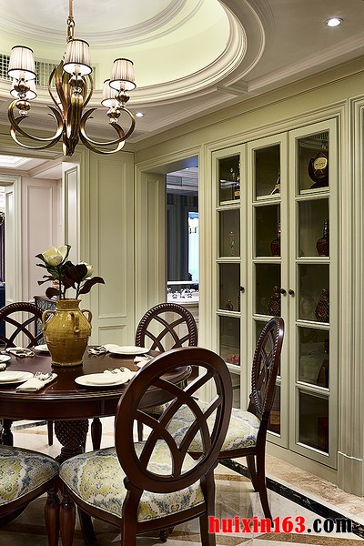本套餐厅装饰中,空间内的石膏板吊顶设计比较简洁,四周使用了简单的线条设计勾勒出了平淡的造型,却使整个空间都显得十分大气,中间的吊灯也在石膏板的衬托下显得更加富有个性,同时也将美式风格的特点彰显了出来。