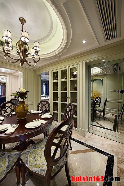 本套餐厅装饰中,空间内的石膏板吊顶设计比较简洁,四周使用了简单的线条设计勾勒出了平淡的造型,却使整个空间都显得十分大气,中间的吊灯也在石膏板的衬托下显得更加富有个性,同时也将美式风格的特点彰显了出来。