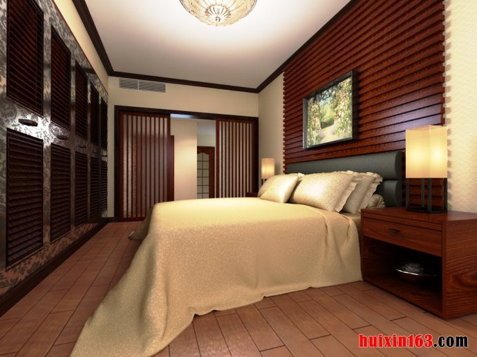 卧室整体设计简约大方又不失古雅质朴之感,营造出了亦古亦今的家居氛围,浓浓的古韵中透着些许现代气息。实木线装饰卧室吊顶,中式镂空雕花灯罩吸顶灯装饰,为家居增添了浓浓的古典韵味。