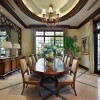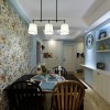 开放式的餐厅与客厅共用同一空间,吊顶的设计巧妙的将空间隔成了不同领域,餐厅张一款格子图案的桌布凸显出了空间装饰的主题,搭配的铁艺框架的木质座椅,更是为装饰增添了设计感,使整个空间的设计中都可以散发出一种个性气息。