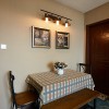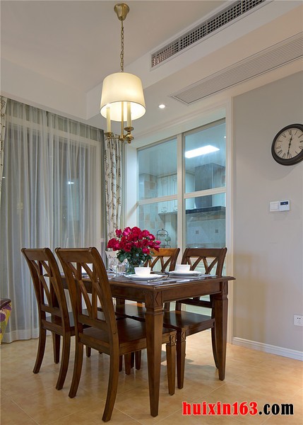 美式风格的居室装饰中不需要太过繁杂的造型设计,也不需要太多的色彩搭配,整体装饰可以带给人们一种自然气息就好,空间内的主色调一般会以温馨为主,这样可以从装饰的细节中透露出一丝亲切感。 本套餐厅装饰中空间内的色彩搭配比较淡雅,石膏板吊顶的设计也比较简洁,但正因如此,餐桌上方的吊灯才会显得更加别致,也可以将吊灯的设计感衬托出来,一款实木材质的餐桌也因此而显得更加典雅、高贵。 更多»推荐家装效果图