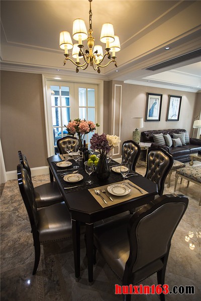 美式风格的居室装饰中不需要太过繁杂的造型设计,也不需要太多的色彩搭配,整体装饰可以带给人们一种自然气息就好,空间内的主色调一般会以温馨为主,这样可以从装饰的细节中透露出一丝亲切感。 本套餐厅装饰中空间内的色彩搭配比较淡雅,石膏板吊顶的设计也比较简洁,但正因如此,餐桌上方的吊灯才会显得更加别致,也可以将吊灯的设计感衬托出来,一款实木材质的餐桌也因此而显得更加典雅、高贵。 更多»推荐家装效果图