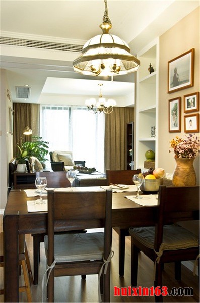本套餐厅装饰中石膏板吊顶的设计比较具有个性,圆形的吊顶做了凹槽的设计,四周的的夹层处安装了一圈白色的灯带,可以使中间的吊灯衬托的更加具有设计感,同时也将下方的实木餐桌衬托的更加高档。