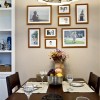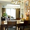 本套餐厅装饰中石膏板吊顶的设计比较具有个性,圆形的吊顶做了凹槽的设计,四周的的夹层处安装了一圈白色的灯带,可以使中间的吊灯衬托的更加具有设计感,同时也将下方的实木餐桌衬托的更加高档。