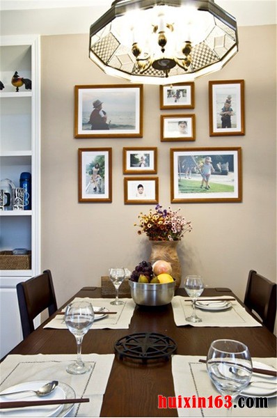 本套餐厅装饰中石膏板吊顶的设计比较具有个性,圆形的吊顶做了凹槽的设计,四周的的夹层处安装了一圈白色的灯带,可以使中间的吊灯衬托的更加具有设计感,同时也将下方的实木餐桌衬托的更加高档。