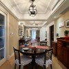本套餐厅装饰的整体效果可以带给我们一种时尚感与奢华的气息,空间内的石膏板吊顶造型虽然简洁,但搭配上中间的吊灯后便会彰显出一丝设计感,下方的白色石材餐桌也在吊灯的照射下而显得更加高档、别致。