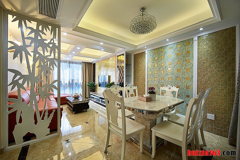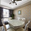 本套餐厅装饰的整体效果可以带给我们一种时尚感与奢华的气息,空间内的石膏板吊顶造型虽然简洁,但搭配上中间的吊灯后便会彰显出一丝设计感,下方的白色石材餐桌也在吊灯的照射下而显得更加高档、别致。