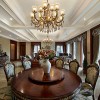 本套餐厅装饰中石膏板吊顶的饿造型设计比较简洁,四周的灯带设计也十分具有设计感,中间的吊灯虽然小巧但也充满时尚感,下方的餐桌搭配上黑白相间的皮质座椅更是可以将美式风格的设计彰显的淋漓尽致。