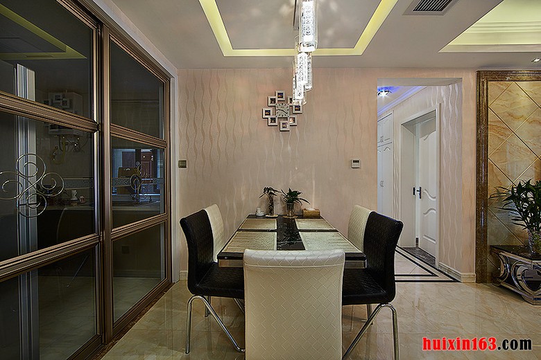 本套餐厅装饰中石膏板吊顶的饿造型设计比较简洁,四周的灯带设计也十分具有设计感,中间的吊灯虽然小巧但也充满时尚感,下方的餐桌搭配上黑白相间的皮质座椅更是可以将美式风格的设计彰显的淋漓尽致。