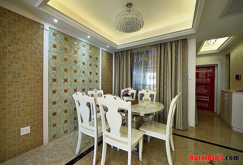本套餐厅装饰中石膏板吊顶的饿造型设计比较简洁,四周的灯带设计也十分具有设计感,中间的吊灯虽然小巧但也充满时尚感,下方的餐桌搭配上黑白相间的皮质座椅更是可以将美式风格的设计彰显的淋漓尽致。