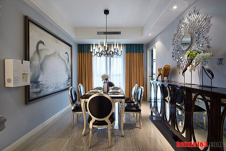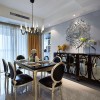 本套餐厅装饰中石膏板吊顶的饿造型设计比较简洁,四周的灯带设计也十分具有设计感,中间的吊灯虽然小巧但也充满时尚感,下方的餐桌搭配上黑白相间的皮质座椅更是可以将美式风格的设计彰显的淋漓尽致。