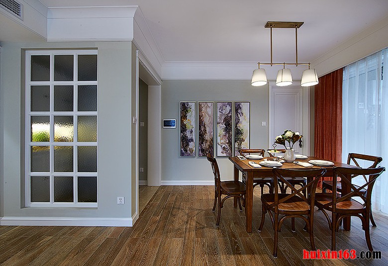 美式风格的餐厅设计中,会将空间的功能性放在第一位,在满足空间功能性可以正常发挥的前提下,才会加入一些具有装饰效果的装饰品,也会在空间内添加一些软装,使其空间显得更加具有设计感。