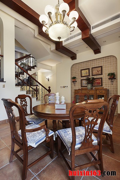 美式田园风格的装饰在选择装饰材料是会比较注重光挺、华丽的材质,在搭配上灯光的照射,可以使整个空间都显得十分唯美、精致,在餐厅空间中还会添加一些新鲜花朵或是绿植,来增添清新气息。