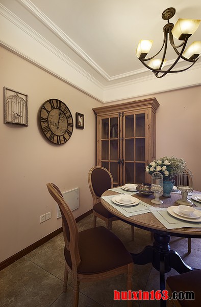 美式田园风格的装饰在选择装饰材料是会比较注重光挺、华丽的材质,在搭配上灯光的照射,可以使整个空间都显得十分唯美、精致,在餐厅空间中还会添加一些新鲜花朵或是绿植,来增添清新气息。