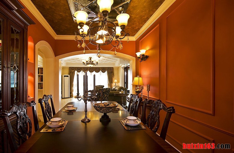 美式田园风格的装饰在选择装饰材料是会比较注重光挺、华丽的材质,在搭配上灯光的照射,可以使整个空间都显得十分唯美、精致,在餐厅空间中还会添加一些新鲜花朵或是绿植,来增添清新气息。