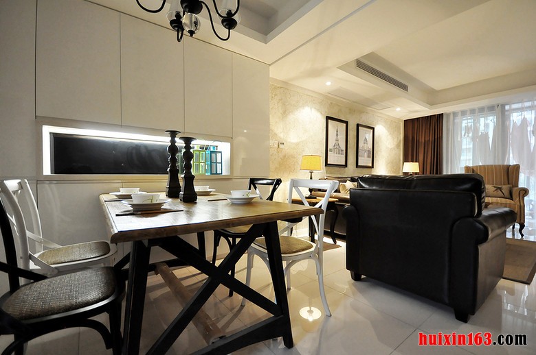 本套餐厅装饰中空间内的整体设计比较具有古典气息,空间内的主色调是以白色为主,但餐桌以及灯具的色彩则比较偏暗,在白色的背景下也会显得更加典雅和富有设计感。