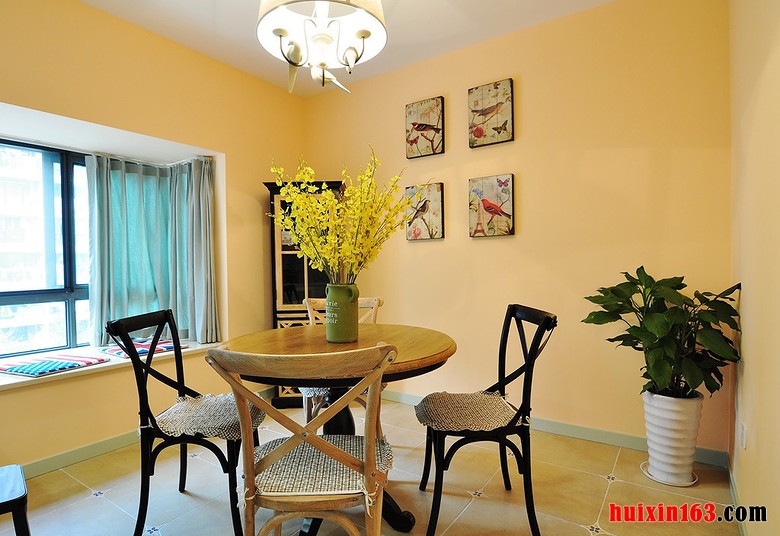 美式田园风格的装饰在选择装饰材料是会比较注重光挺、华丽的材质,在搭配上灯光的照射,可以使整个空间都显得十分唯美、精致,在餐厅空间中还会添加一些新鲜花朵或是绿植,来增添清新气息。