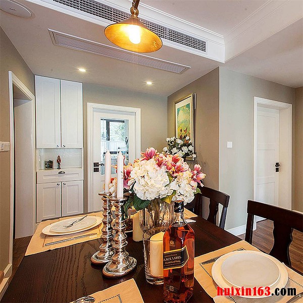 美式田园风格的装饰在选择装饰材料是会比较注重光挺、华丽的材质,在搭配上灯光的照射,可以使整个空间都显得十分唯美、精致,在餐厅空间中还会添加一些新鲜花朵或是绿植,来增添清新气息。
