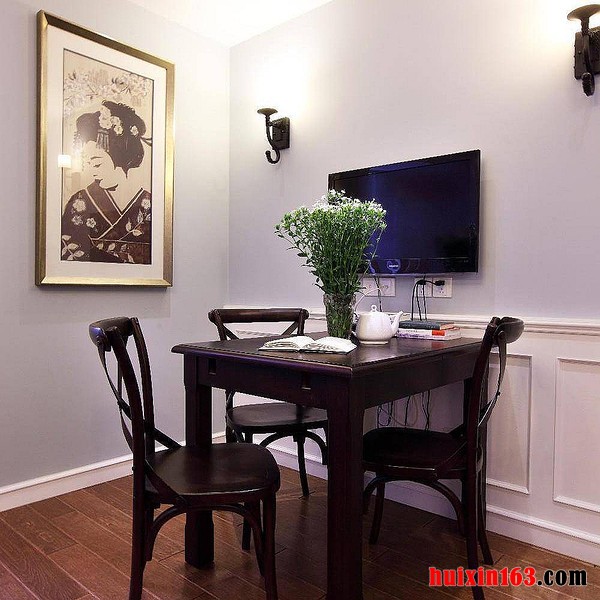 本套餐厅装饰中空间内的整体设计比较具有古典气息,空间内的主色调是以白色为主,但餐桌以及灯具的色彩则比较偏暗,在白色的背景下也会显得更加典雅和富有设计感。