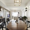 本套餐厅装饰中石膏板吊顶的造型设计比较简洁,纯白色的背景可以将中间的黑色铁艺吊灯衬托的更加富有设计感,白色的灯罩也显得更加柔和,下方的实木餐桌上搭配了一款色彩较暗的桌布,更是为空间装饰增添了典雅的气息。