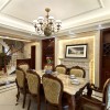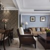本套餐厅装饰中空间内的装饰都比较简洁,没有过于繁杂的造型设计,也没有艳丽的色彩点缀,但就是这样素雅的空间,可以将美式风格的特点彰显的更加透彻,实木餐桌上铺设了一款柔软的桌布,更是凸显了质感与设计特色。