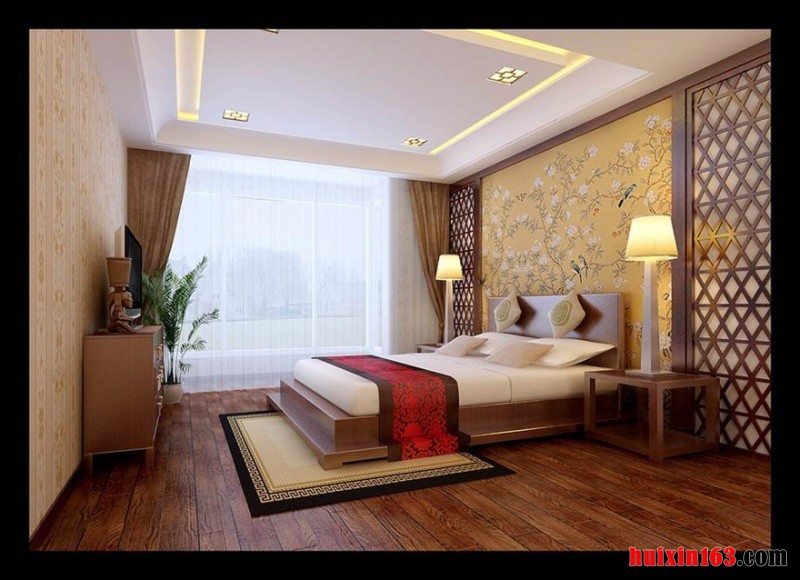简洁大方的卧室吊顶设计,实木线装饰让吊顶显得棱角清晰,立体雅致,造型别致的铁艺吊灯搭配,为吊顶锦上添花,实木壁架及墙壁灯点缀,整体设计古雅而纯朴,体现出了古典家居风格的质朴及返璞归真的境界。简约古典风格装饰与自然佩饰的完美结合,线条与壁纸的连贯结合,解决背景墙小气使电视背景变得大气,也使整个居住空间弥漫着淡雅古典的浪漫风情。