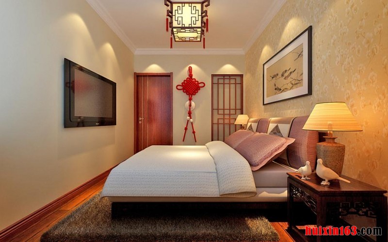 简洁大方的卧室吊顶设计,实木线装饰让吊顶显得棱角清晰,立体雅致,造型别致的铁艺吊灯搭配,为吊顶锦上添花,实木壁架及墙壁灯点缀,整体设计古雅而纯朴,体现出了古典家居风格的质朴及返璞归真的境界。简约古典风格装饰与自然佩饰的完美结合,线条与壁纸的连贯结合,解决背景墙小气使电视背景变得大气,也使整个居住空间弥漫着淡雅古典的浪漫风情。