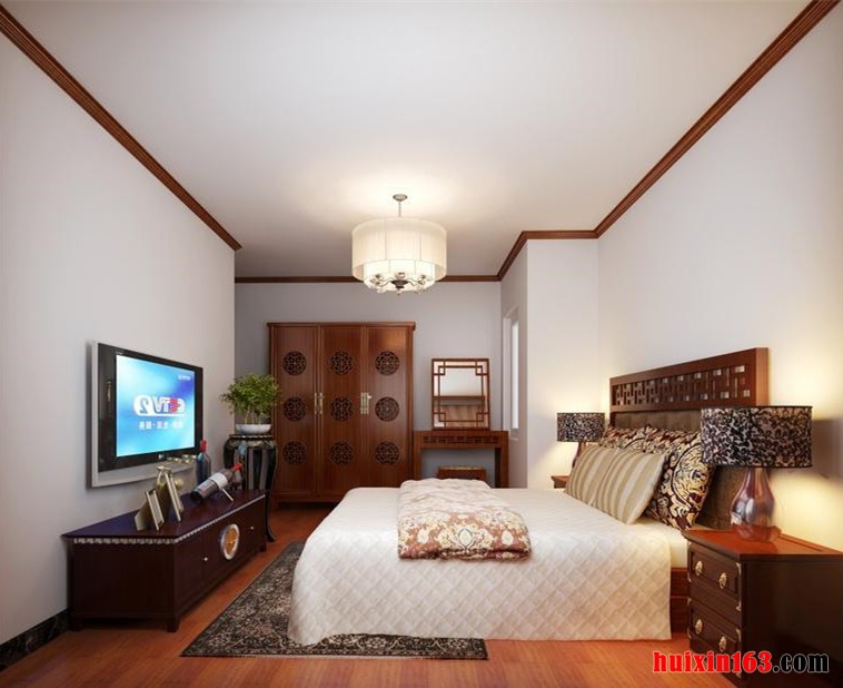 简洁大方的卧室吊顶设计,实木线装饰让吊顶显得棱角清晰,立体雅致,造型别致的铁艺吊灯搭配,为吊顶锦上添花,实木壁架及墙壁灯点缀,整体设计古雅而纯朴,体现出了古典家居风格的质朴及返璞归真的境界。简约古典风格装饰与自然佩饰的完美结合,线条与壁纸的连贯结合,解决背景墙小气使电视背景变得大气,也使整个居住空间弥漫着淡雅古典的浪漫风情。