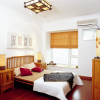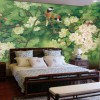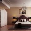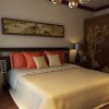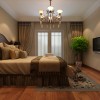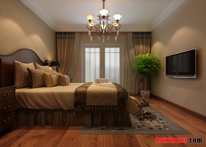 卧室吊顶可以设计黑色木结构框架,顶梁起伏造型设计,适当雕花修饰,较深的颜色,给人尊贵而古雅、深沉稳重之感。实木复合地板铺地,清晰的纹理,自然的颜色,让人感觉既浪漫又艺术。电视背景墙的设计比较简单,可以带给人们一种舒适感。