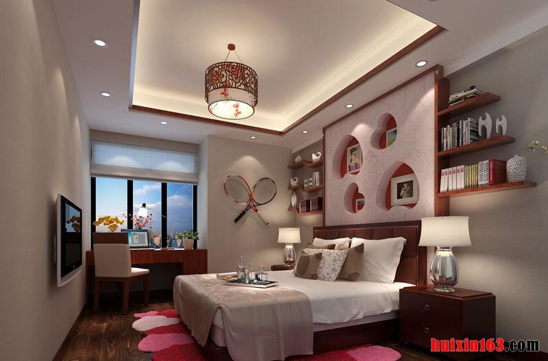 卧室吊顶可以设计黑色木结构框架,顶梁起伏造型设计,适当雕花修饰,较深的颜色,给人尊贵而古雅、深沉稳重之感。实木复合地板铺地,清晰的纹理,自然的颜色,让人感觉既浪漫又艺术。电视背景墙的设计比较简单,可以带给人们一种舒适感。