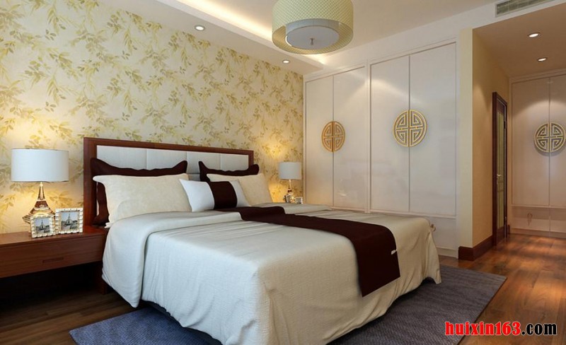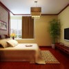 卧室吊顶可以设计黑色木结构框架,顶梁起伏造型设计,适当雕花修饰,较深的颜色,给人尊贵而古雅、深沉稳重之感。实木复合地板铺地,清晰的纹理,自然的颜色,让人感觉既浪漫又艺术。电视背景墙的设计比较简单,可以带给人们一种舒适感。