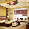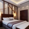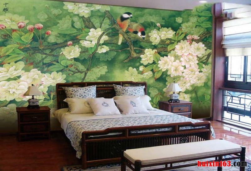 卧室吊顶可以设计黑色木结构框架,顶梁起伏造型设计,适当雕花修饰,较深的颜色,给人尊贵而古雅、深沉稳重之感。实木复合地板铺地,清晰的纹理,自然的颜色,让人感觉既浪漫又艺术。电视背景墙的设计比较简单,可以带给人们一种舒适感。