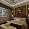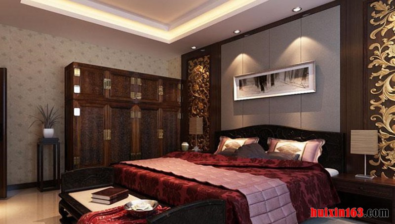 卧室吊顶可以设计黑色木结构框架,顶梁起伏造型设计,适当雕花修饰,较深的颜色,给人尊贵而古雅、深沉稳重之感。实木复合地板铺地,清晰的纹理,自然的颜色,让人感觉既浪漫又艺术。电视背景墙的设计比较简单,可以带给人们一种舒适感。
